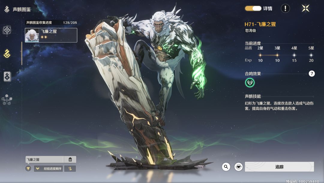声骇技能:使用后幻形成为飞廉之猩进行踢击。踢击造成231.84%/210.11% /188.37%/166.64% 气动伤害,追击造成283.36%/256.80%/230.23%/203.67% 气动伤害。追击命中后,自身气动伤害加成提升12.00%,重击伤害加成提升12.00%,持续15秒。