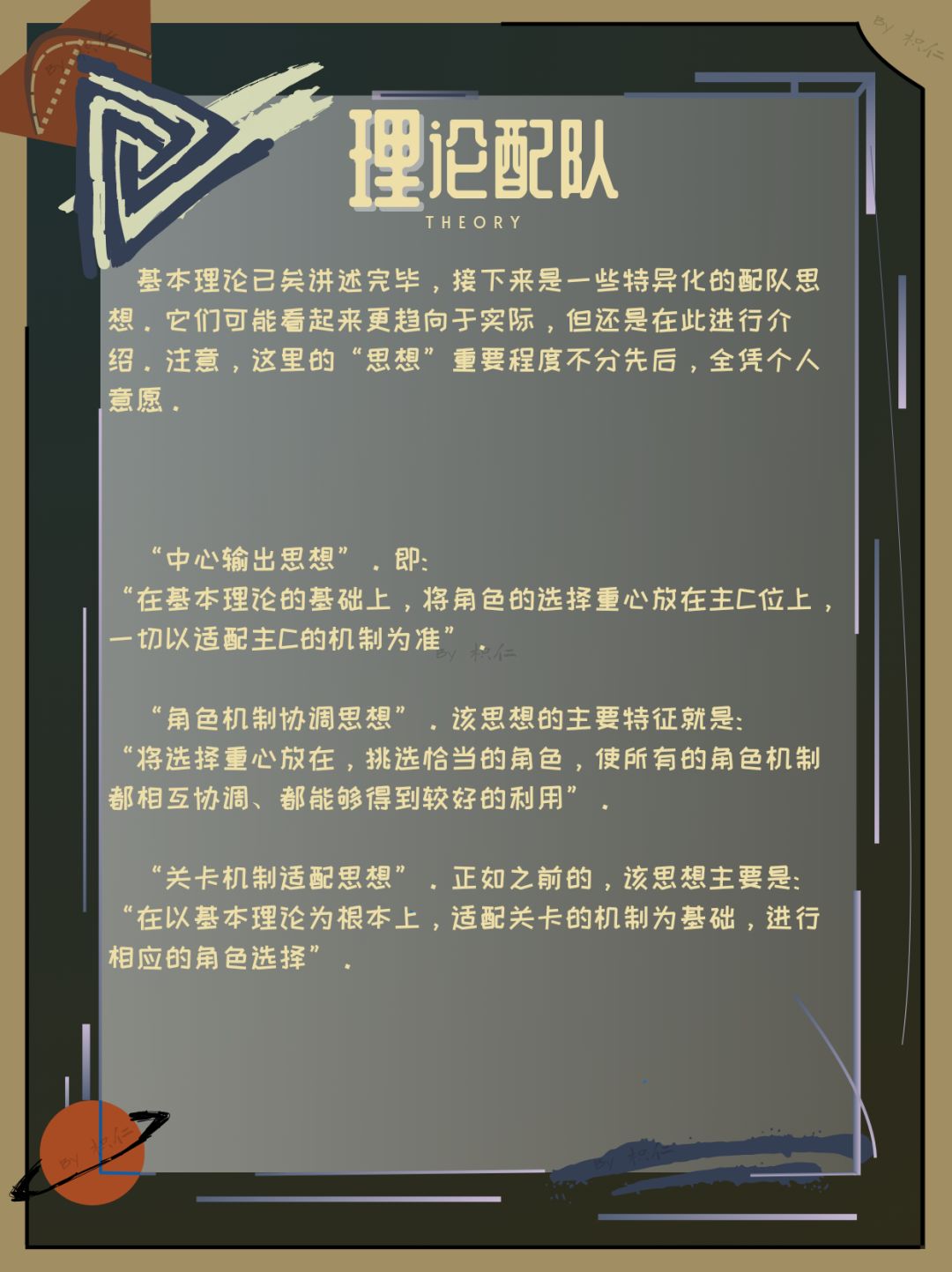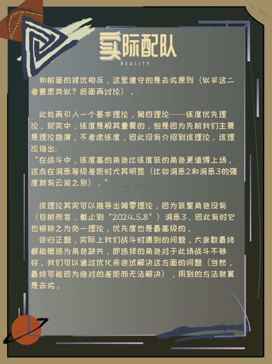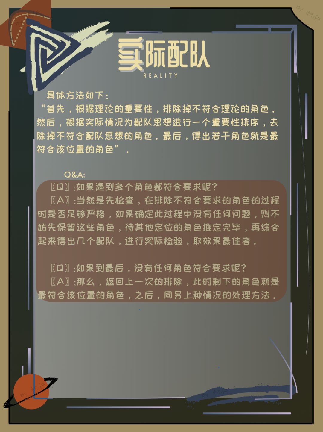 首先,笔者个人将配队的流程分为两个阶段——理论配队和实际配队。理论配队指的是仅根据各种机制和基本配队理论进行的角色选择,实际配队指的是根据实际拥有的角色以及其练度进行的角色配选。