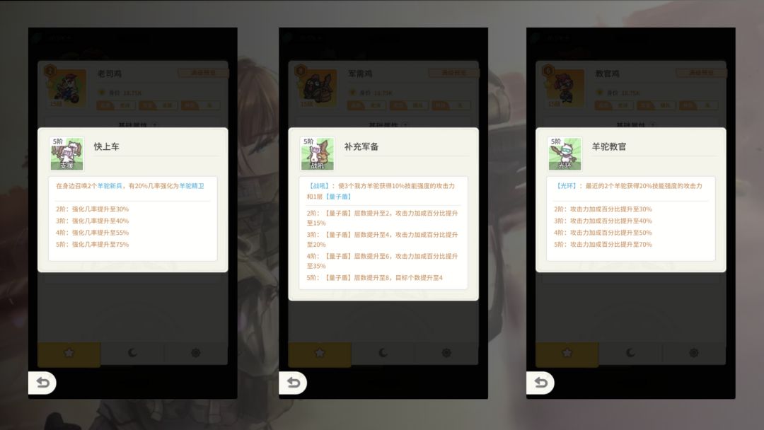 因为起到强化羊驼攻击属性的卡牌炊事鸡(没满)、通信鸡(没出)、特战鸡(没出),所以现在这里进行一个大胆的比较与猜测(后续更新后此处会添加真实测试数据):