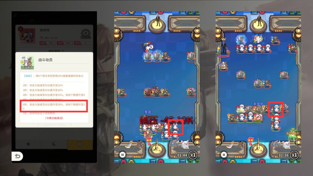 (2)因为羊驼本身很脆,所以上述施加buff的单位也不可以入场太晚,不但数量锐减,同时死亡制造的伤害收益也极低。所以要在召唤单位同排搭配守护和提供量子盾的单位,以确保统帅鸡等入场时,能够给满技能效果。
