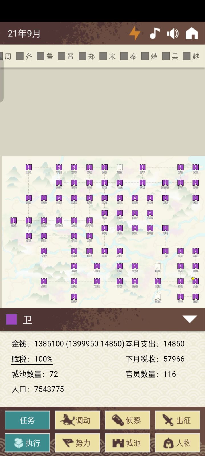 游戏虽然有bug,但也不难,把税收直接调到最大,开局统帅的将越高越好,人口方面你不打就会主动上涨,建议打一个大后方,放着上着人口,利用将领职位来运输人口即可,接着,就是抓统帅高的将,弓,布,戟,马,最厉害的就是马兵了。