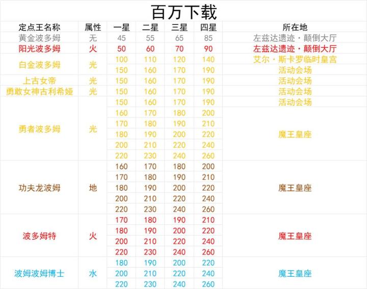 3勇者波多姆小队,因为基本上一直都是打他们,所以以boss为分类,分别记录了不同等级难度的级别,属性无变化