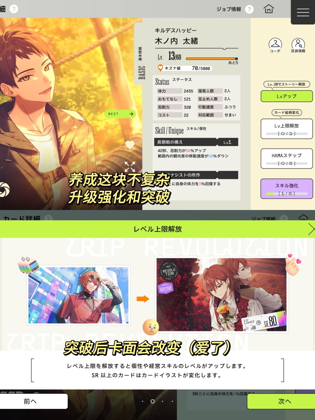 抽卡和养成这块我没什么涉及,浅看了一下并不复杂,就是普通的强化和突破,突破后卡面会有变化。目前的缺点是无中文+上线后一直更新个不停,总结一下就是熟悉日语或者有翻译器的可以入坑玩玩,不方便游玩的姐妹可以预约看看国服有没有机会出