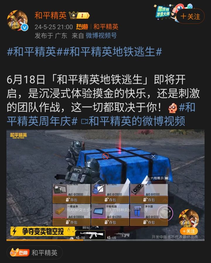 《和平精英》国服的地铁逃生模式将于6月18日正式上线。地铁逃生模式是《PUBG M》推出的摸金模式,玩家可以尝试多种不同的摸金撤离策略,无论是选择刚硬对抗还是隐蔽苟存,都可以在这个模式中找到适合自己的玩法。