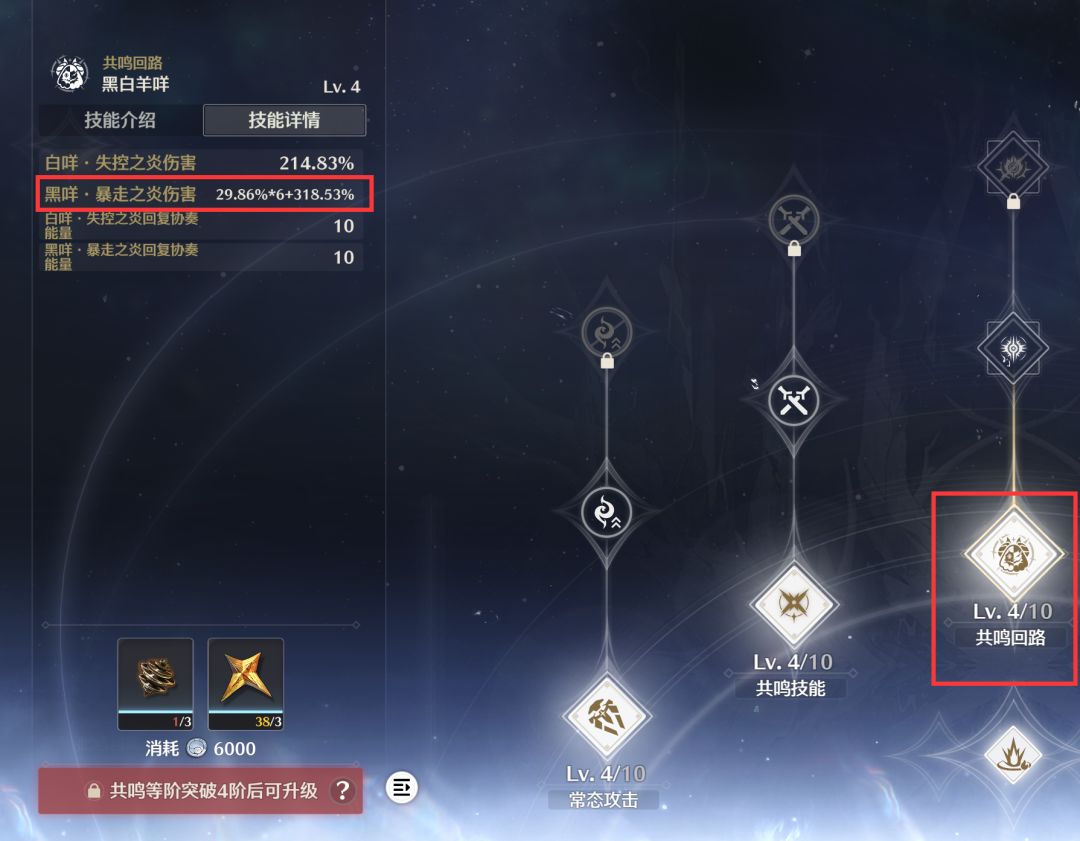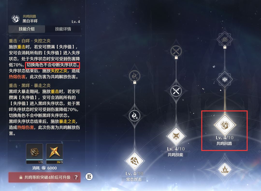 然后就是安可的共鸣回路了,这个回路大大的优化了安可共鸣条满了后的重击手感,大家都知道安可满共鸣条后的重击会让安可呆呆的在原地吟唱读条几秒钟才能释放出来,但是共鸣回路可以让安可吟唱读条的时候通过换人的方式把安可放在原地自爆,这样就不会有这几秒的中空期了。虽然吟唱过程中安可会得到一个70%的免伤,但是能不挨打不是更好么,当然你想用这来硬抗一波伤害也可以。需要注意的点是开大招之后记得在大招没结束之前用重击进入失序状态后在换人,大招期间的安可自爆伤害加成更高。