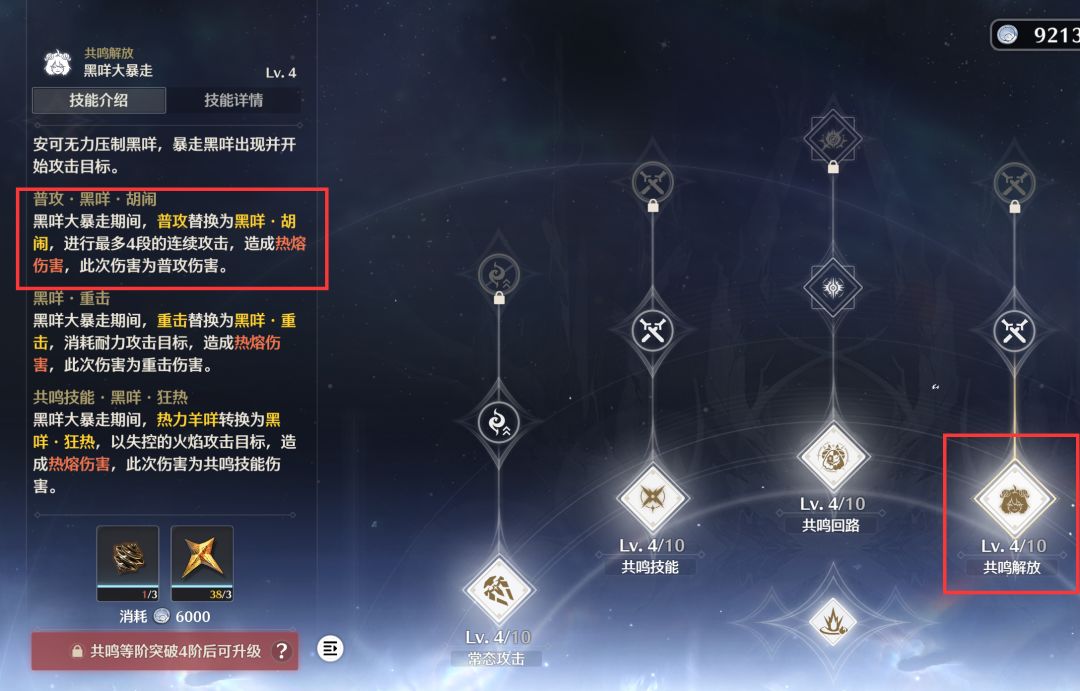 接着就是技能介绍了,首先就是共鸣技能,这个小技能有一个需要注意的点就是大家在释放小技能的时候记得多按下小技能或者普攻释放小技能的后续招式,不按的话就不会释放后续招式导致亏伤害。(虽然打boss的时候需要频繁闪避导致打不满伤害,但是打小怪这aoe很爽)。
