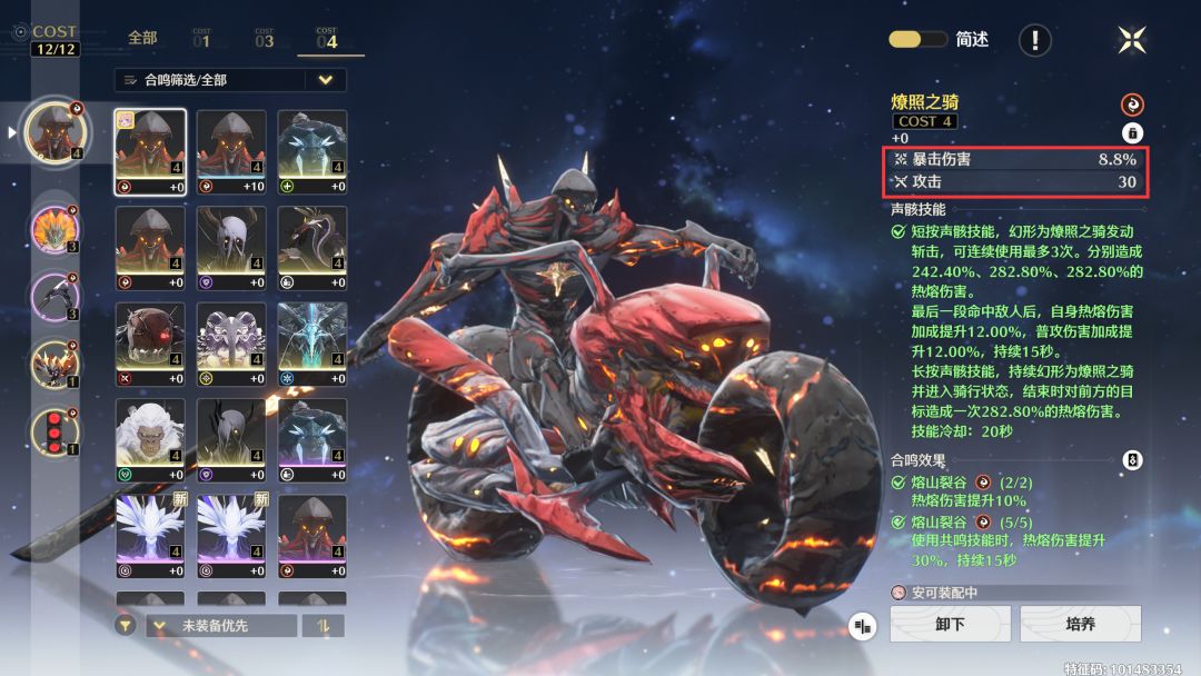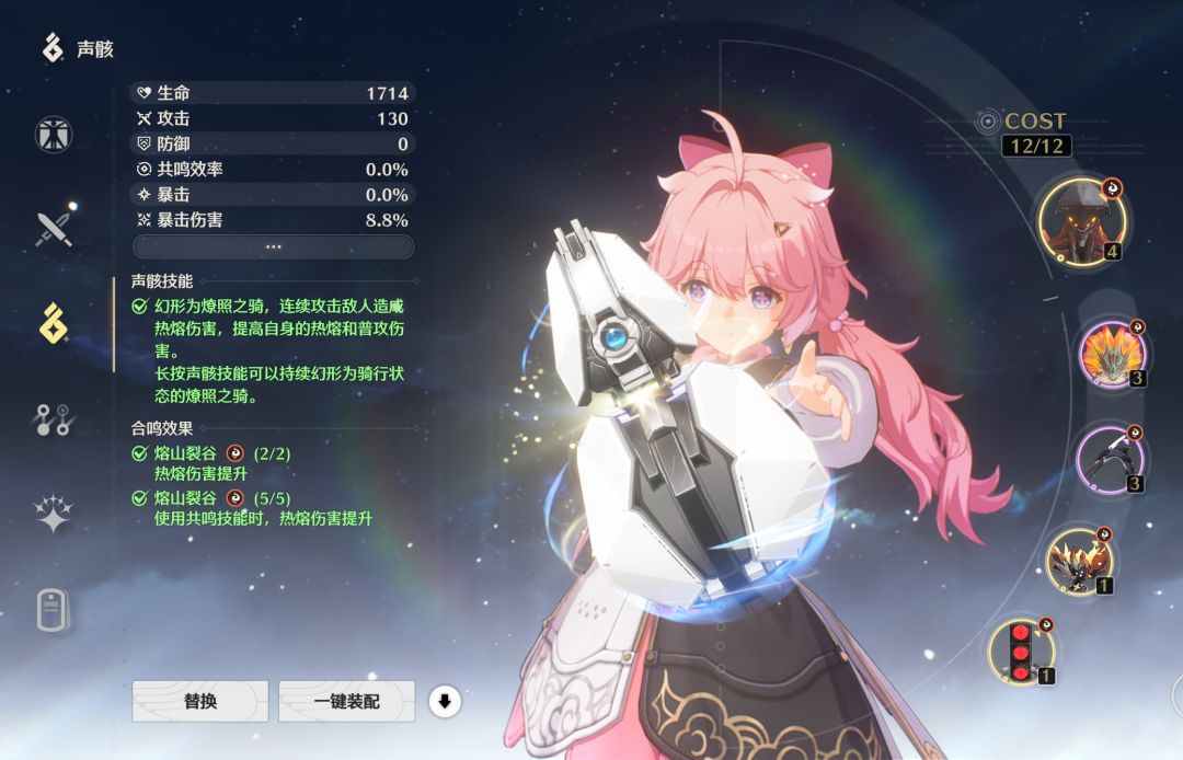 首先就是声骸选择了,直接用熔山裂谷五件套。主声骸技能用燎照之骑,我想没人能拒绝大世界变身摩托车开冲吧?主属性推荐暴击率,因为目前武器不提供暴击。这个声骸技能伤害也很高,给的伤害加成也非常契合安可。