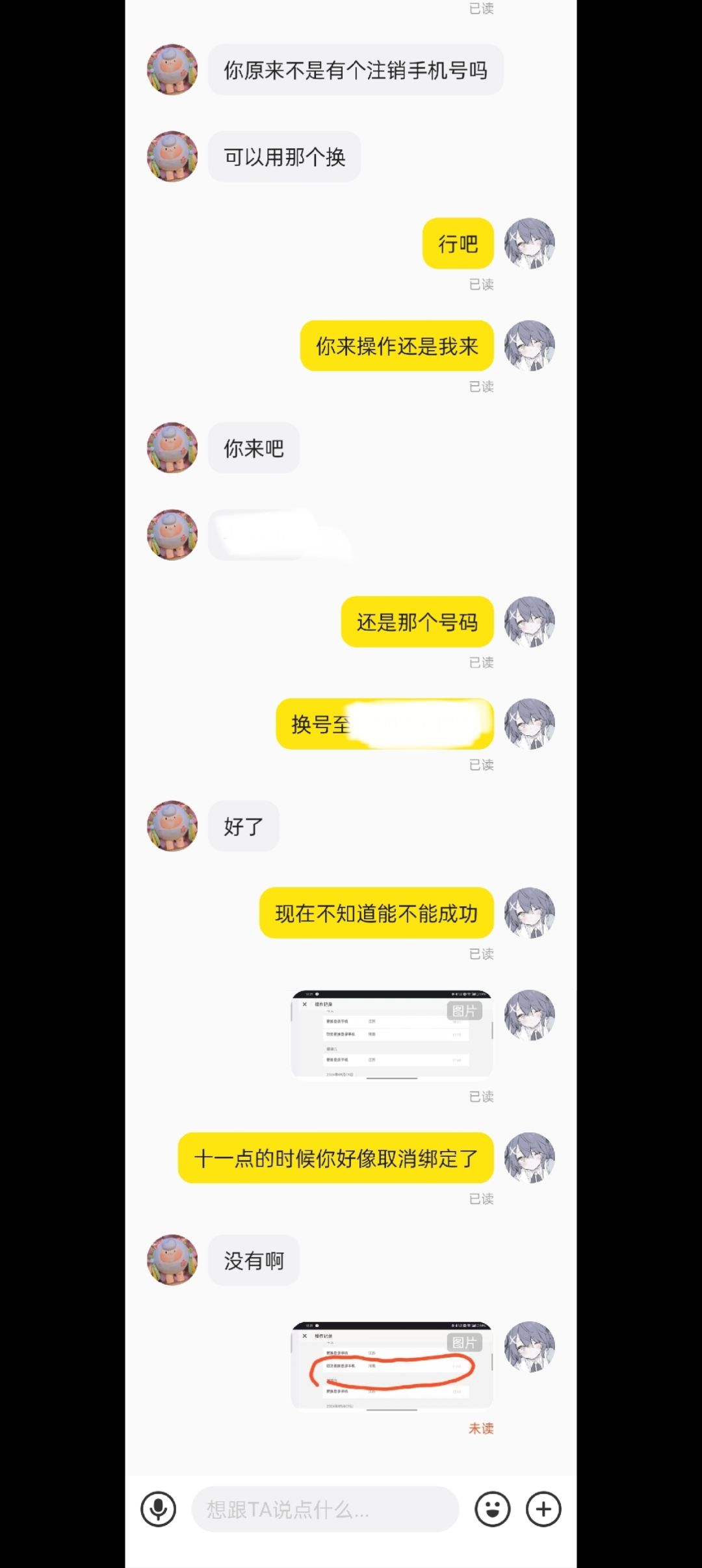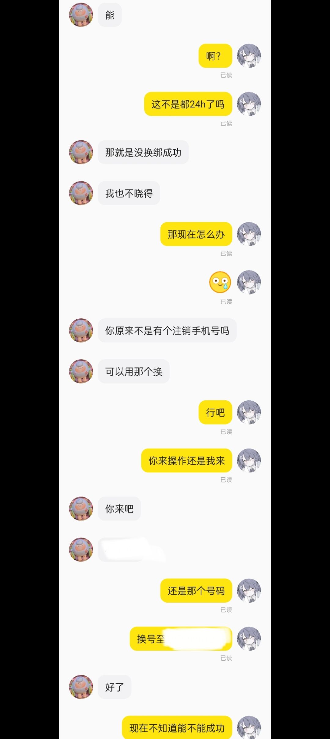 4过了二十四小时之后我尝试用我的第一个手机号进行登录发现登录是一个新号,然后询问卖家,与卖家此时尝试沟通后,他也承认没绑定成功