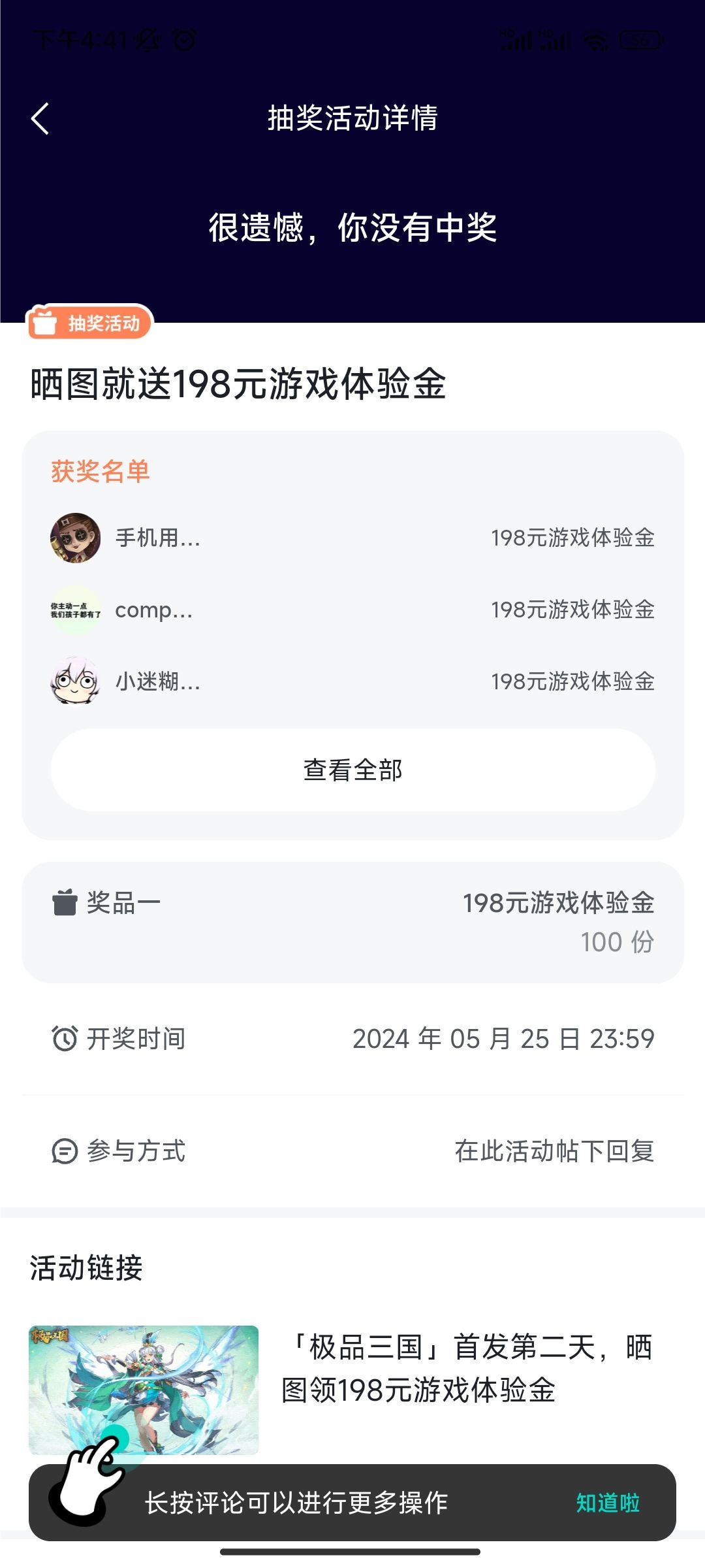 骗子活动,100份奖才抽50个不到。