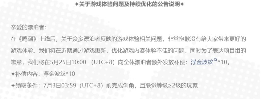 其次:小花分析潮宝们都知道鸣潮在23号开服以来,那网上的评论可谓是非常负面的,基本都是喷鸣潮的,但潮宝们喷的在理,确实是有很大的问题!但这次鸣潮的策划可谓是非常迅速的出了致歉公告:“非常抱歉给大家带来不好的体验,然后后续会立马对问题进行优化!”同时还给了up池的十连抽!emmm……鸣潮你这认错态度,让潮宝们刚到嘴的话都放不出来了~只能说很强昂!没有让事情发酵!比某雕好多了!然后我们来看一下鸣潮的后续优化方向,小花捡重点的说!