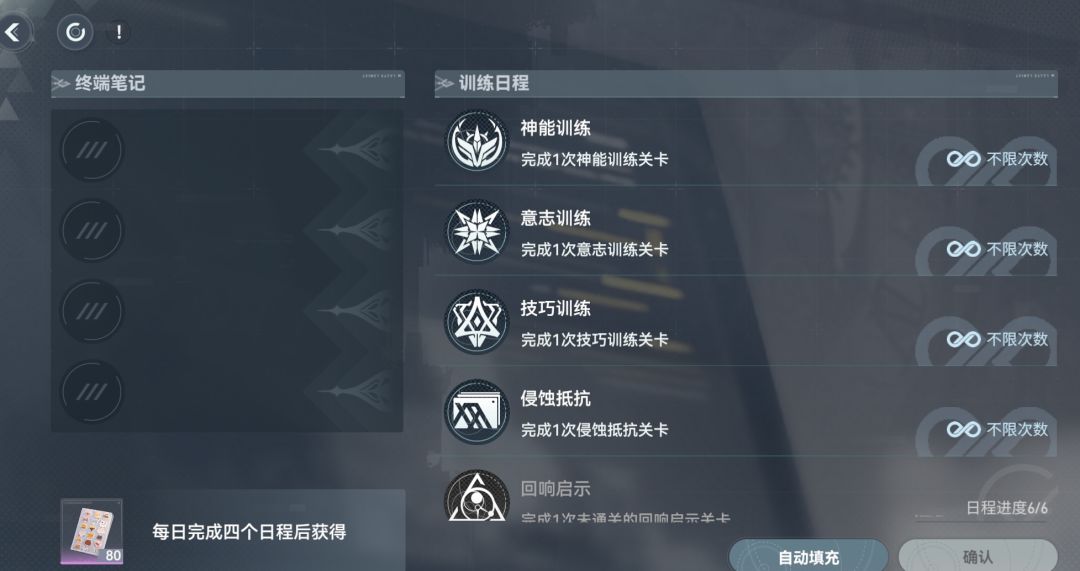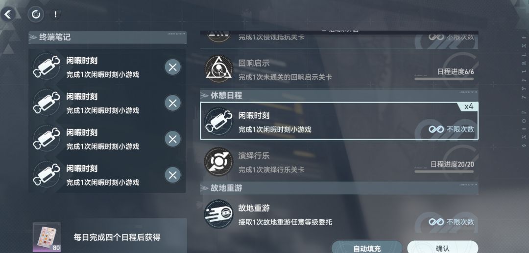 省流: 每天流程是选4个终端笔记任务,然后完成获得对应所选任务和完成每日任务80材料,然后去玩闲暇时刻获得30材料,最后派遣,按需选择,记得收菜