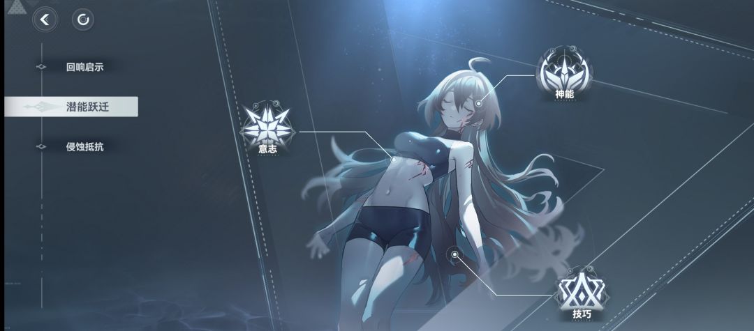 ②潜能跃迁(前置条件:通关回响启示6关后解锁。还是切换薇儿打怪)在这里又分为3种类型(一种是意志,一种是神能,一种是技巧)其下又分为3种级别,初中高。