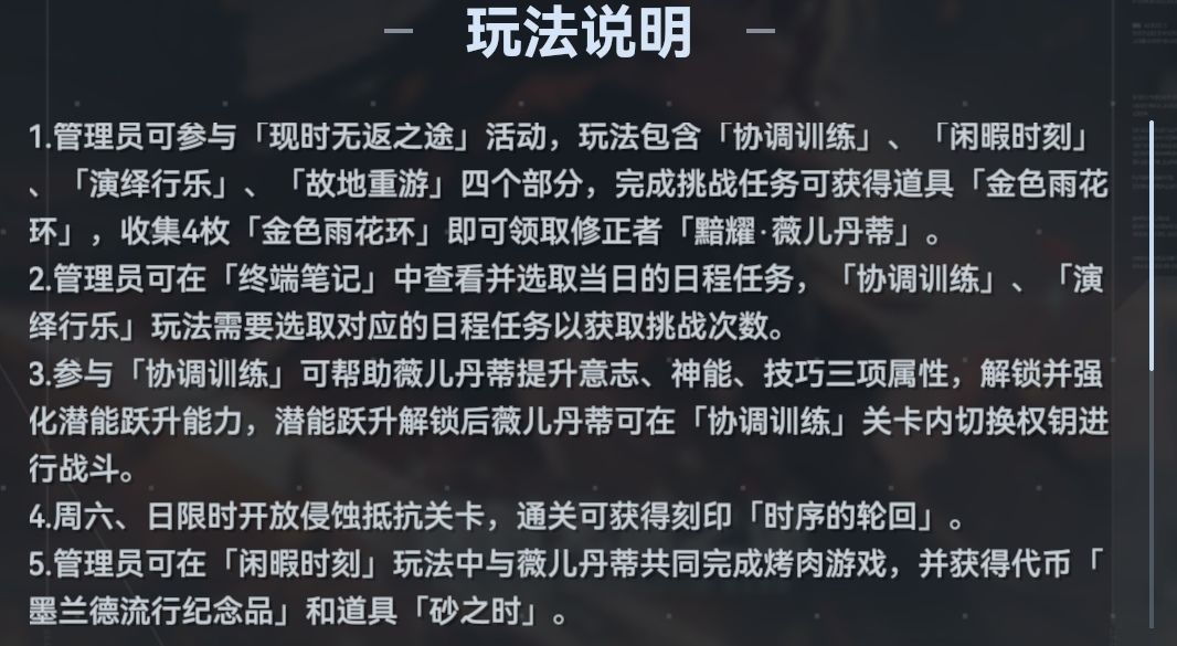 故地重游(派遣,3个进行中,周六周日达标打侵蚀抵抗中的轻量诱导和重量诱导,无次数也可以打虽然不给材料,但能解锁两个派遣栏)