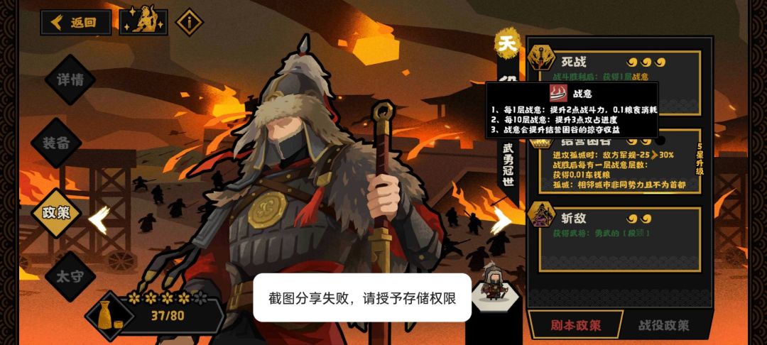 首先先说死战技能,战斗胜利1次加1次战意,最多加50战意,而该政策做完后会附赠10战意,相当于还有40战意需要你代打。1战意加2战力,最多加到100战力,增加5粮食消耗。当然再增加消耗的同时,也会有相应的掠夺奖励。这点相对于粮食消耗来说可能有些杯水车薪,但没有钱财消耗,玩家可以用得到钱财进行买粮食。也是相当于把该技能做到相应的平衡,这点不再多说。