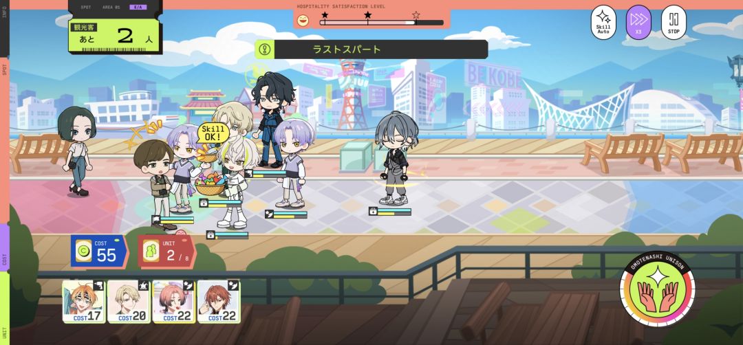 战斗是塔防形式,其他游戏是打掉“怪物”的血量,这里是给“怪物”加血,也就是满足观光值。我们的小人似乎是会持续掉血,毕竟做活动是会掉精力的,所以小人脚底上面得是血量,下面是能量槽。