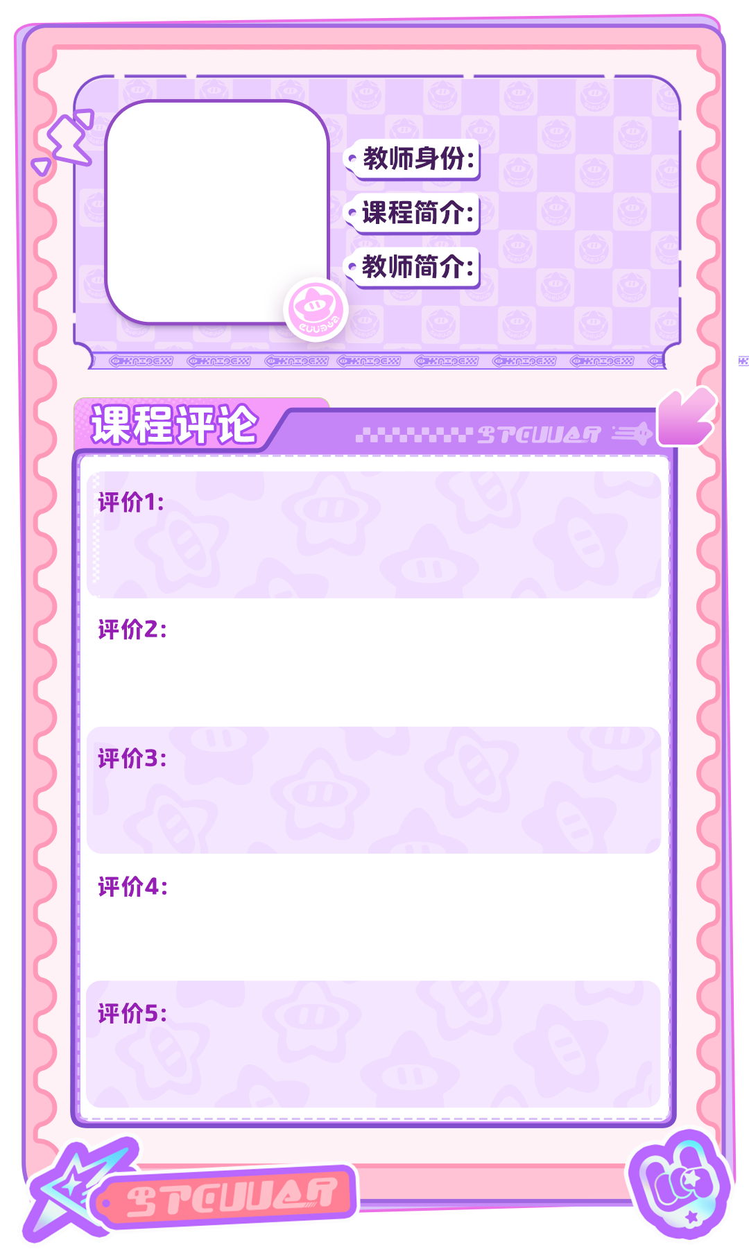 有些星宝的点评太过幽默,看完都害我笑一下!不过光看还不过瘾,星妹也想上手评价两句呢!所以我准备了一份空白模板!星宝们想给哪个身份的老师点评呢?发挥你的奇思妙想吧~