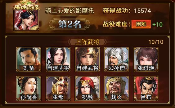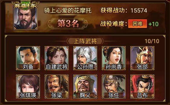 本期益州之战中赢得第三位的是 骑上心爱的花摩托 军团,成功攻破 困难+10。