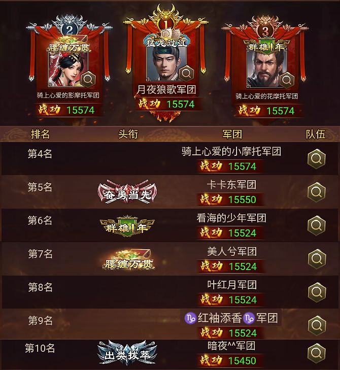 其中,月夜狼歌、骑上心爱的影摩托、骑上心爱的花摩托、骑上心爱的小摩托 军团以 15574 的战功,成功达成益州之战最高战功,拿下TOP4的殊荣,恭喜!