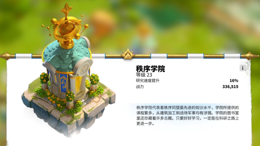 接下来是学院的建设,升级学院可以提升研究速度,节省研究加速消耗。