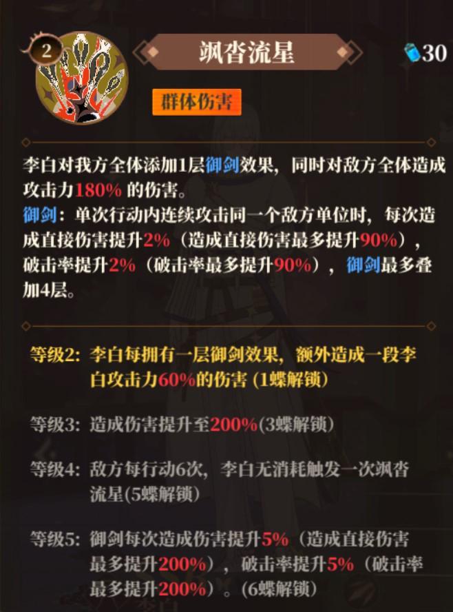 两碟,五蝶是李白提升较明显的两个阶段,自身的技能倍率可以忽略不计,升蝶主要是提高御剑效果的增益能力。