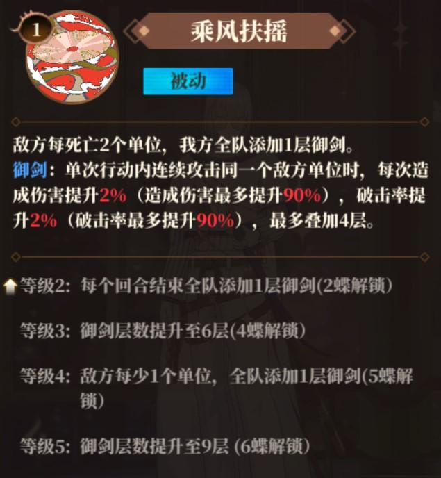 解析:御剑效果可以让单次行动内连续攻击的我方镜灵造成更多伤害,主要表现为直接伤害提升与破击率提升,御剑具有叠加层数限制,最高9层。该技能主要提升在等级4(五碟),加快御剑层数的叠加