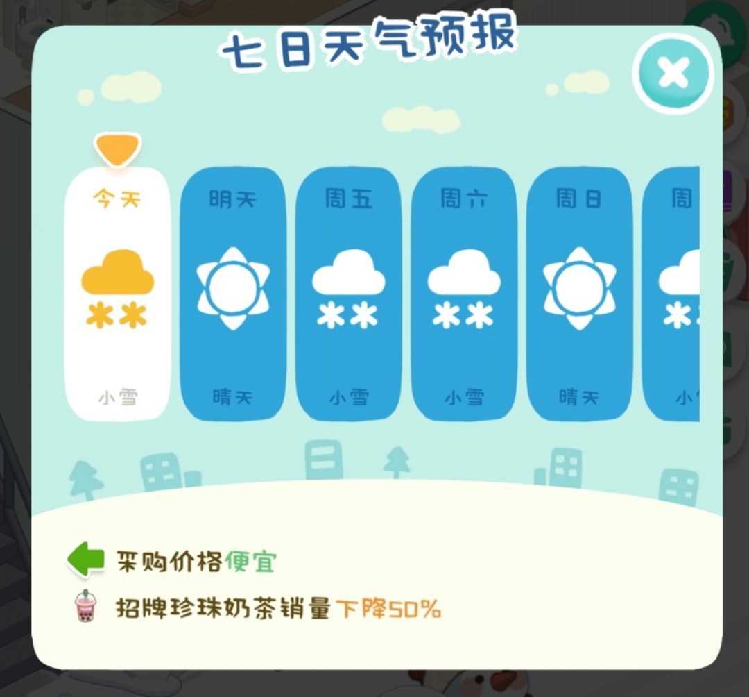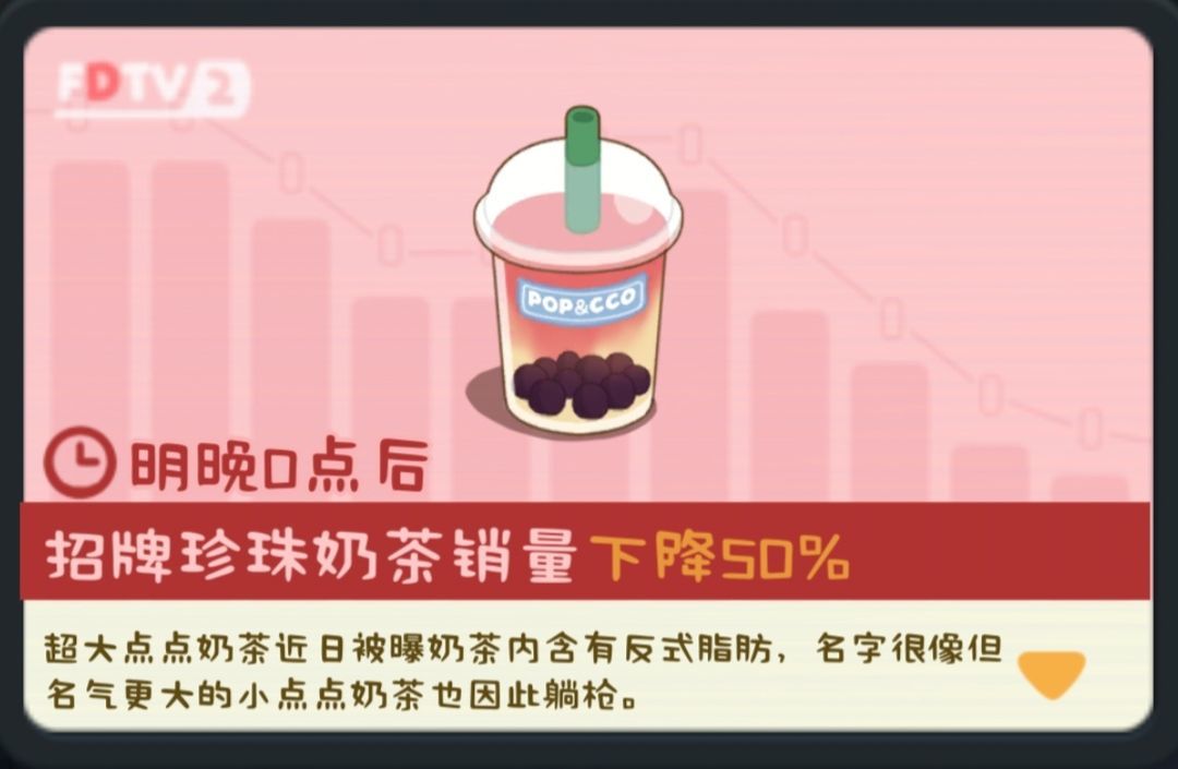 2、正常需求下,每个订单奶茶需求为2。游玩时偶尔会有以下通知弹窗,有两种:销量下降50%、销量上涨50%
