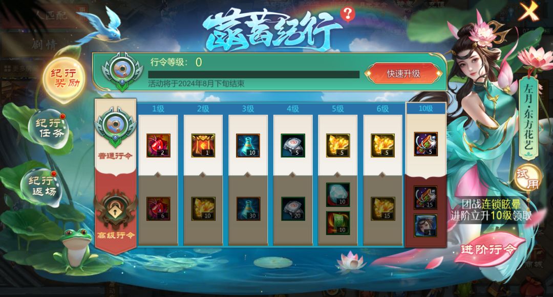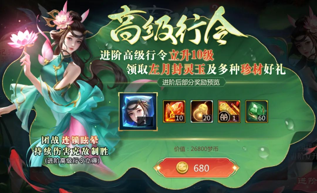 解锁高级行令立升10级,直接领取左月【东方花艺】全新换装!同时,进阶高级行令还可以解锁高级行令奖励的领取资格,蓬莱仙魄、暗金+12卷轴、无极源石、额外月之匙10连、高级补魂玉等更多丰厚的奖励可领!