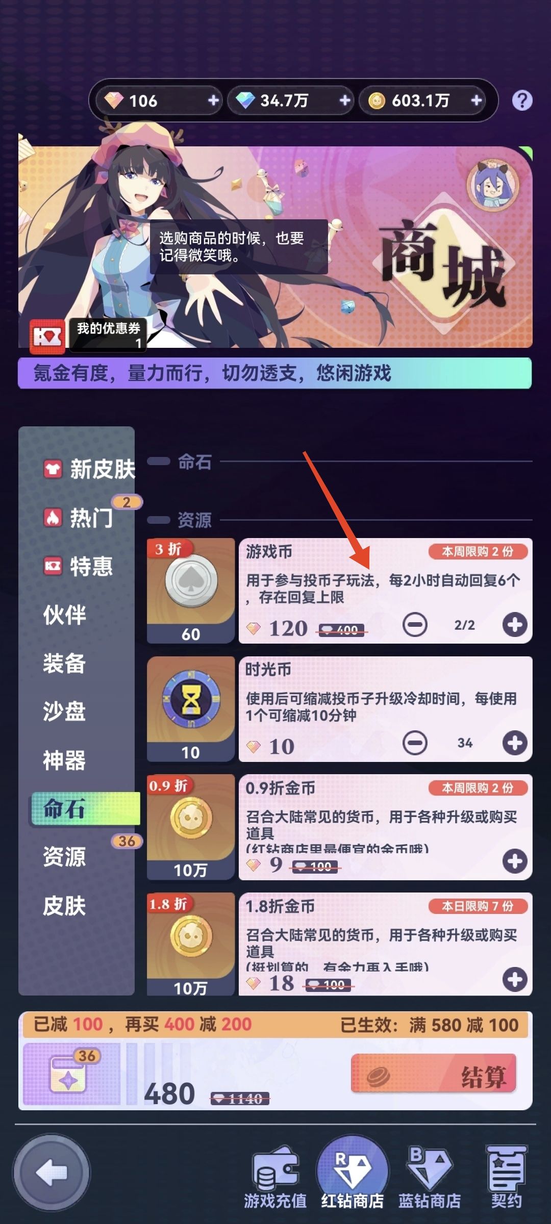 第二个礼包是红钻商店每周刷新两个的120红钻60币子礼包,如有永久卡,每周领完50红钻优惠券后,可以购买两个60币子礼包,6个时光币礼包,优惠减免后合计200红钻(当然有月卡更便宜,还送50减免券,但买月卡是个坑,不要买,白嫖即可)。