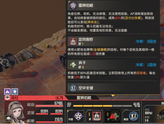 霍姆伯格boss能够呼叫无人机支援,除此之外,没有太多复杂的技能机制。伤害不高,但是整体耐久是所以boss中最多的。此boss需要交给突击手来处理,利用突击武器高额的伤害量,两位突击手机师的伤害便足以,逐渐将其消灭。有一点需要注意的是,霍姆伯格是飞行系的大型机兵,位于障碍物附近时,有时会被阻挡,无法反击我方,利用好此现象可以减少我方机师受到的伤害。