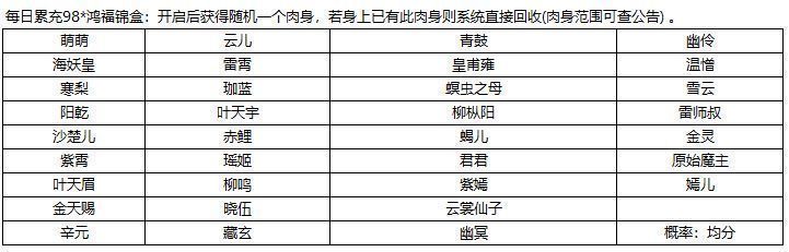 ②、2000充值豪礼:活动期间内如不需要道具3:可联系客服兑换《仙魔灵宝*100》、灰太狼、哮天犬、猩红魔蛛、化龙诀、兽神诀、鲲鹏、鸾鸟、驳、狡、玉兔、血神诀、上古丹书、太阴鬼典、五雷天书、万毒混元、五藏锻元功、九转还魂诀、帝魂诀、天仙大丹诀、斩邪宝篆、飞升诀、化神诀、玉清密录、赵千颖、彭越、钱慧娘、风铃、血锋、水嫣林、八孔双异能胚子其中1个。