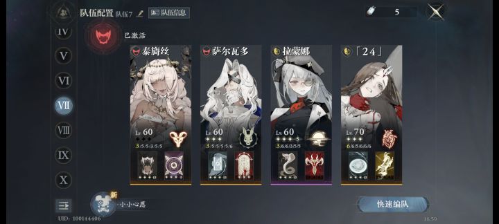 24,随意(我带的红悸懒得换了),专武+银鳕鱼。ps:24可换艾继斯或雷亚,主要是辅助产胎。