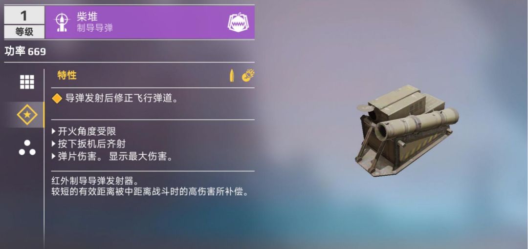 如下图所示,“柴堆”是各位工程师可能会遇到的首款制导导弹。这款导弹以其高命中率和强大的攻击力著称,如果不了解应对方法,它可能在远距离上造成单方面的火力压制。在发射前,这类导弹需要锁定敌人,并在飞行过程中自动修正其弹道,以确保准确命中目标。