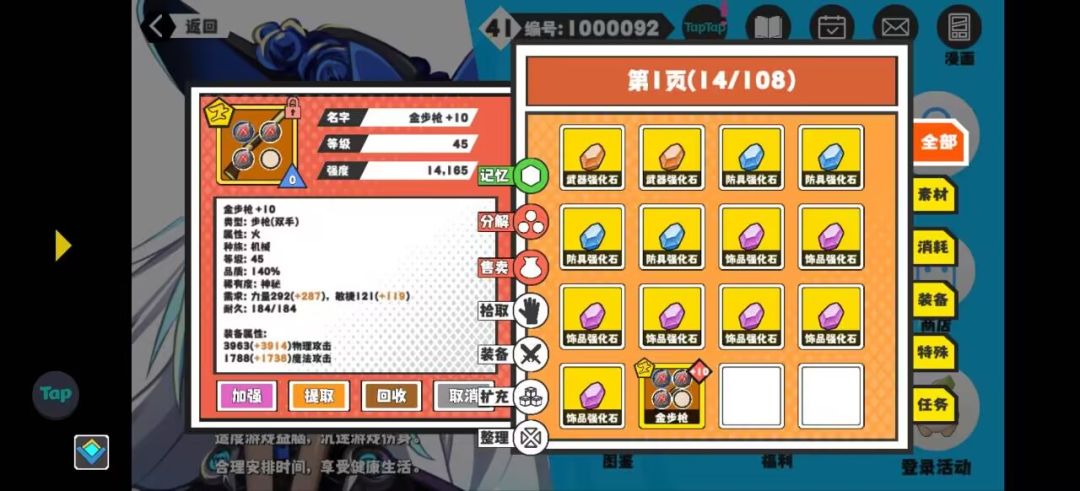 - 金枪+10 :装备品阶、装备类型与强化次数。装备品阶决定了装备等级上下限,如金最高45级,秘银最高55级,不能突破等级上限。