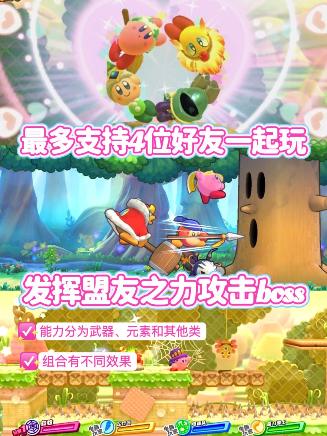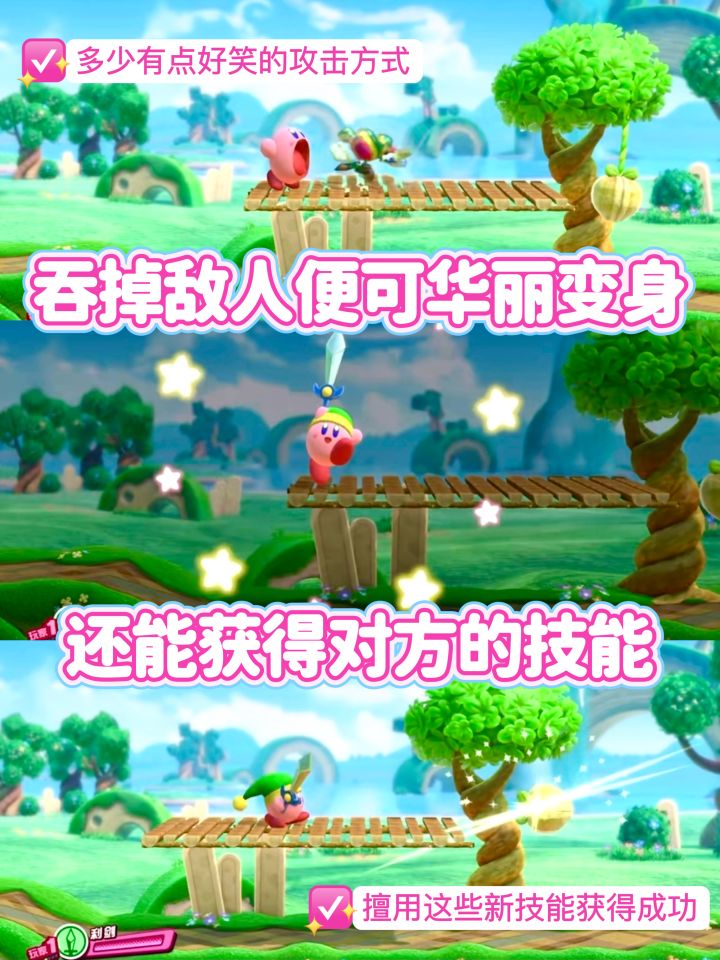 游戏里的卡比形象真的萌化了我的少女心 打斗方式也莫名好笑🤭 吞掉对方便能获得其技能 游戏还支持与好友联机 和好友玩耍时 可以通过组合多元素 发挥最合适的【盟友之力】击败敌人