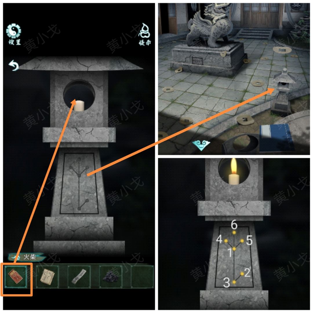 17.点击石灯笼,用【火柴】点燃蜡烛;石柱上的星象闪烁(注意亮起的顺序)