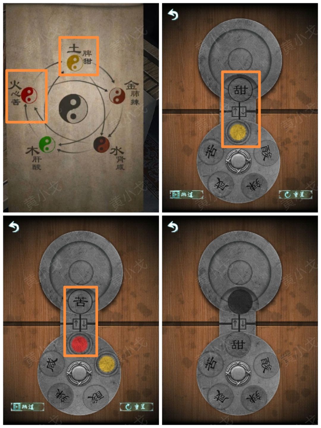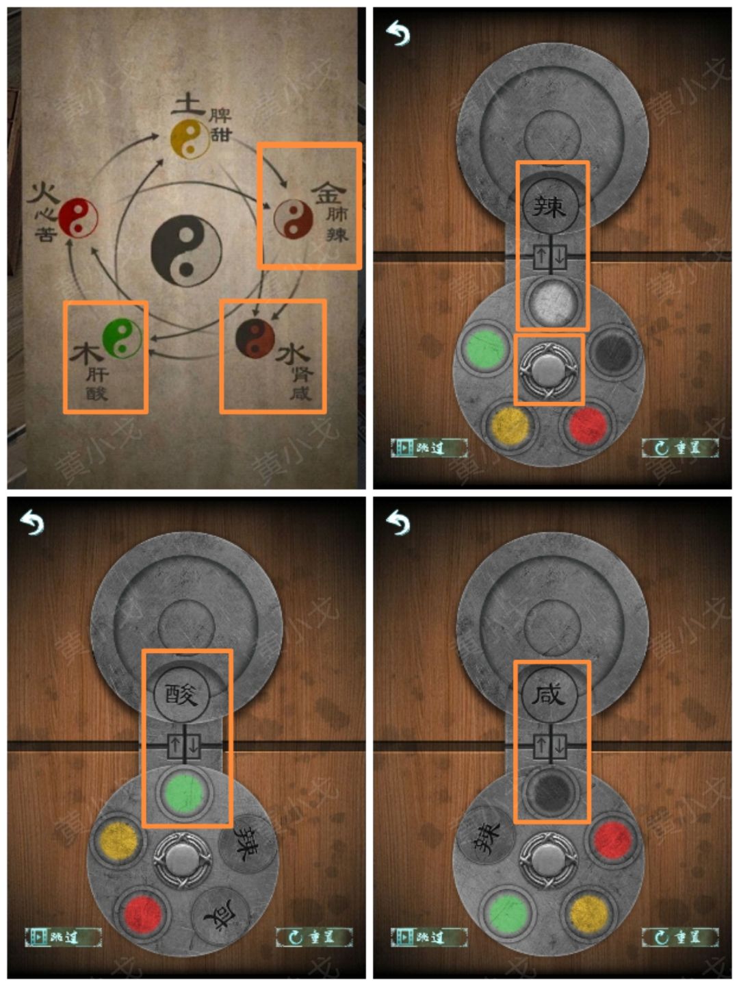 12.根据五行图上的线索,通过调整圆形按钮和箭头按钮,把字块放到对应颜色的圆盘上(辣-白、酸-绿、咸-黑、苦-红、甜-黄)