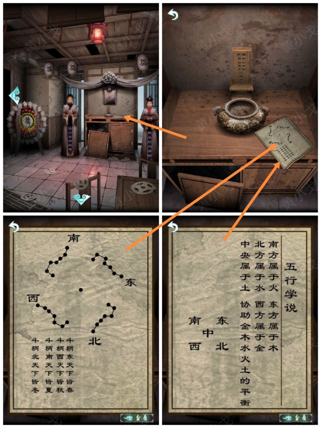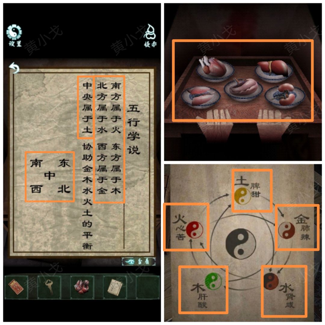 15.根据【两张纸】上的线索(南-火、东-木、北-水、西-金、中-土)和五行图上的线索(土-脾、金-肺、水-肾、木-肝、火-心),调整五脏纸扎的位置(南-火-心、东-木-肝、北-水-肾、西-金-肺、中-土-脾)