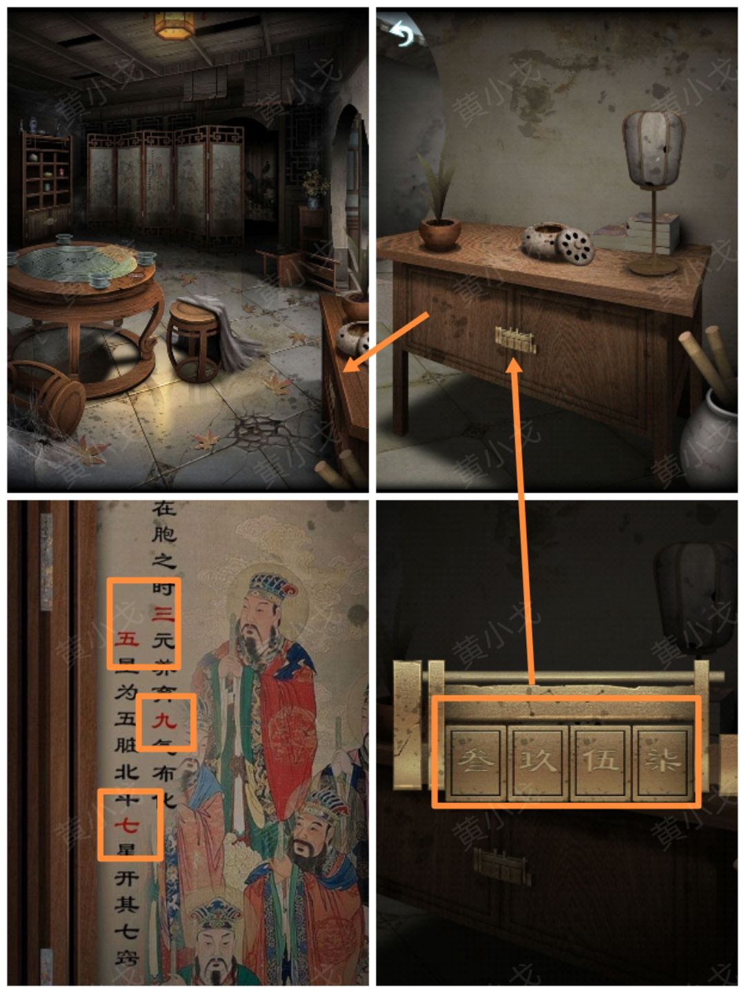 24.点击右边柜子上的密码锁,根据屏风上的线索,输入密码:叁玖伍柒(红字及顺序:三九五七)