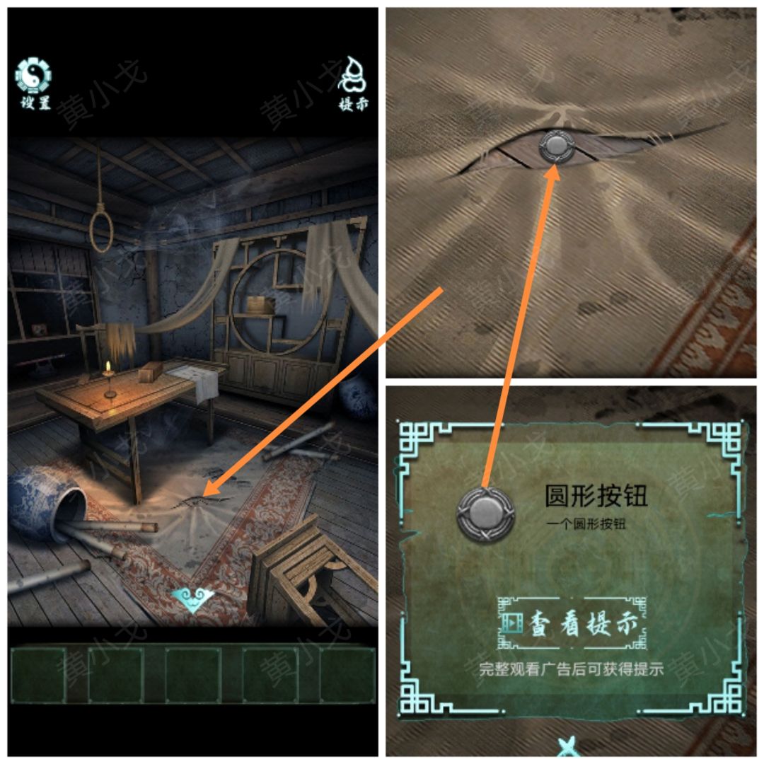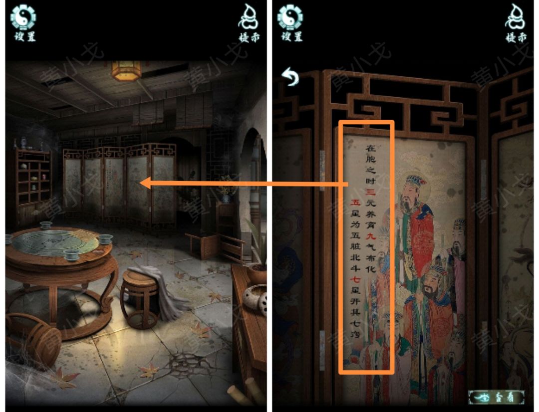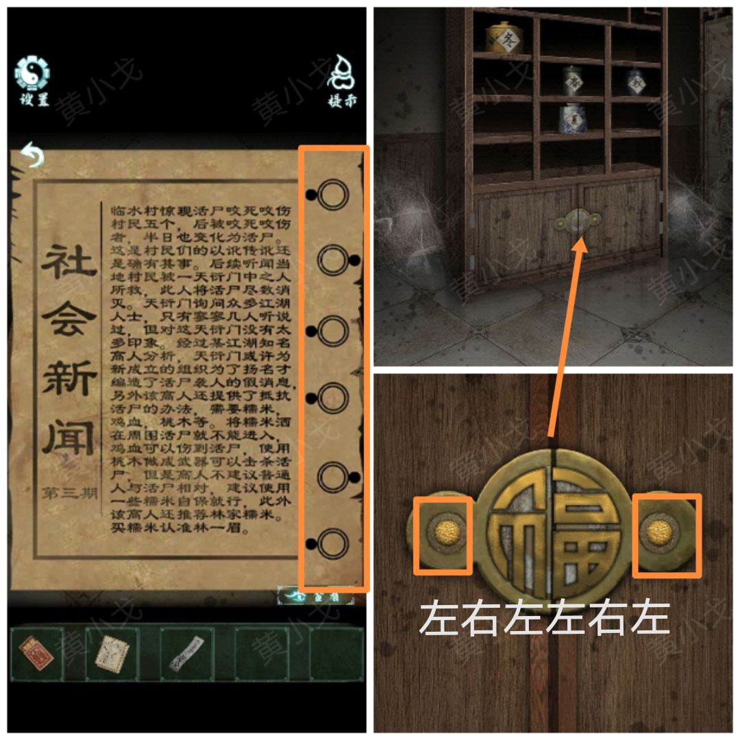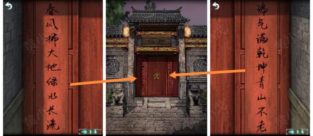 3.点击门上的锁,根据上面的字(左-寿、右-福),结合石狮子上的刻字(福寿寿福福生寿),按(右左左右右左)的顺序点击门环,打开门
