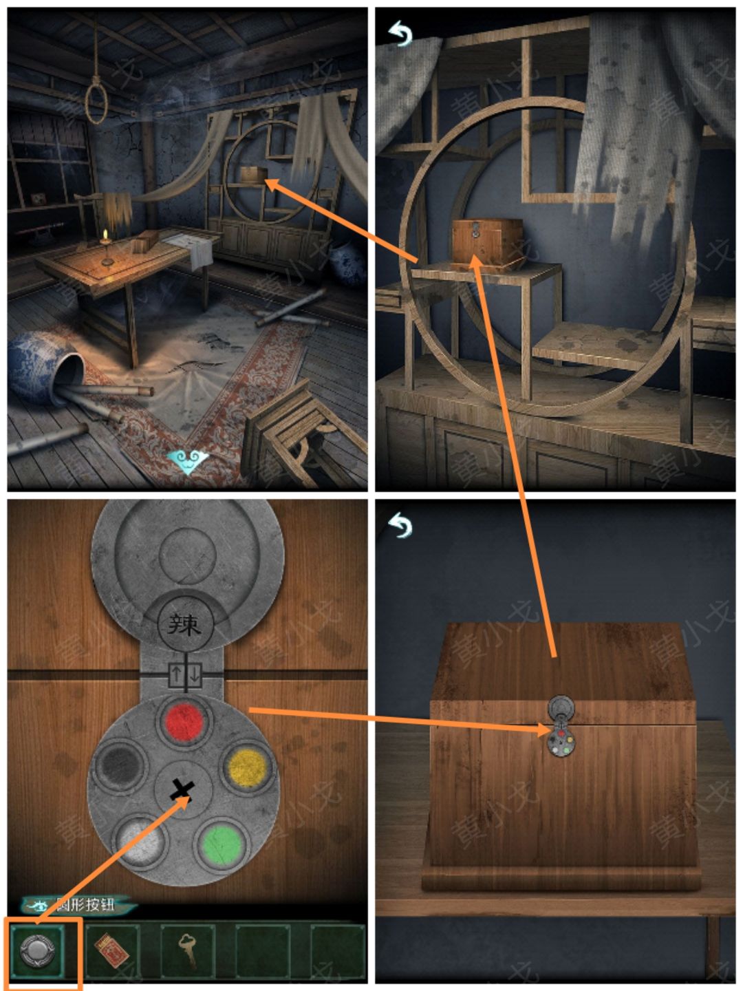 11.点击收藏架上的盒子上的密码锁,放入【圆形按钮】