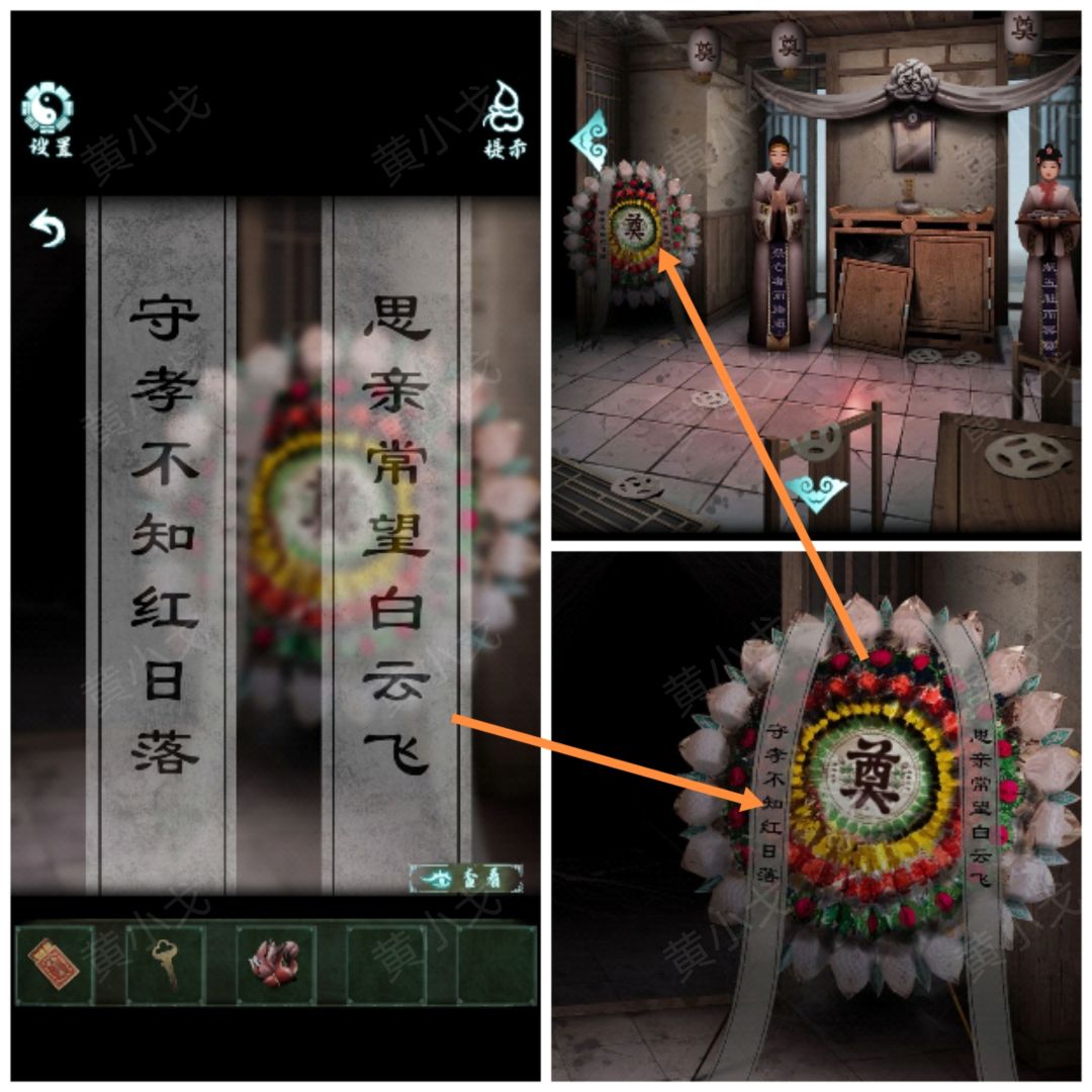 4.(正厅)点击查看花圈上的挽联,获得线索(守孝不知红日落,思亲常望白云飞)
