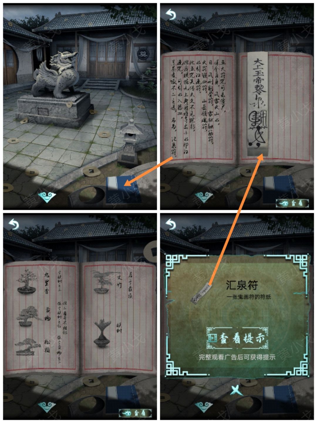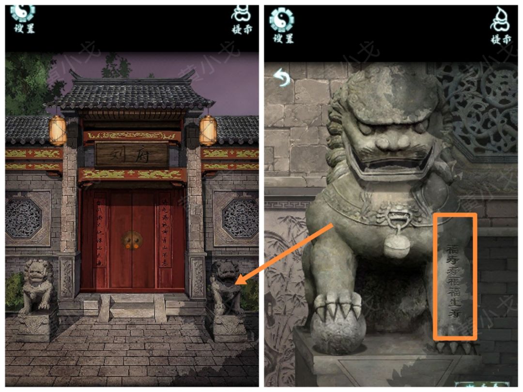 1.(刘府外)点击右边的石狮子,获得线索(福寿寿福福生寿)