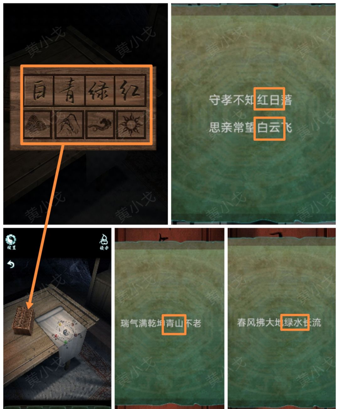 8.点击桌子上的匣子,根据上面的提示(白青绿红),结合门口对联(春风拂大地绿水长流、瑞气满乾坤青山不老)和花圈上的挽联(守孝不知红日落,思亲常望白云飞),调整对应的景(白云、青山、绿水、红日)