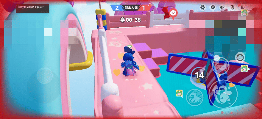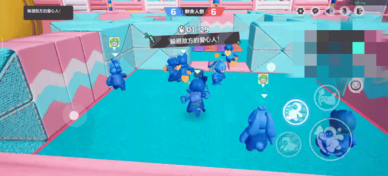 进入游戏后,星宝们会被随机分到蓝色或者红色阵营中,开局后每队会有两名星宝身上携带环绕的爱心。屏幕上方则会实时显示,双方还剩余几名星宝没有被贴上爱心。