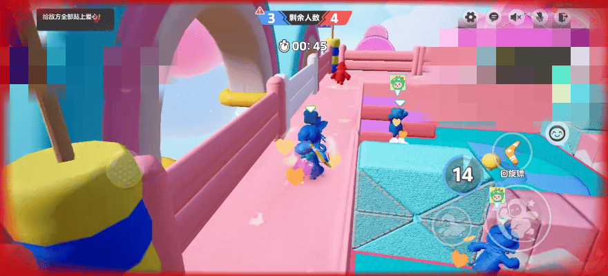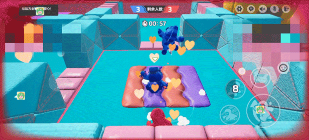 注意!当阵营里只剩下一个身上没带爱心的星宝时,TA的头顶会出现高亮标记哟,快和队友们加速追上去,别让TA逃出满满爱心的包围圈呦!