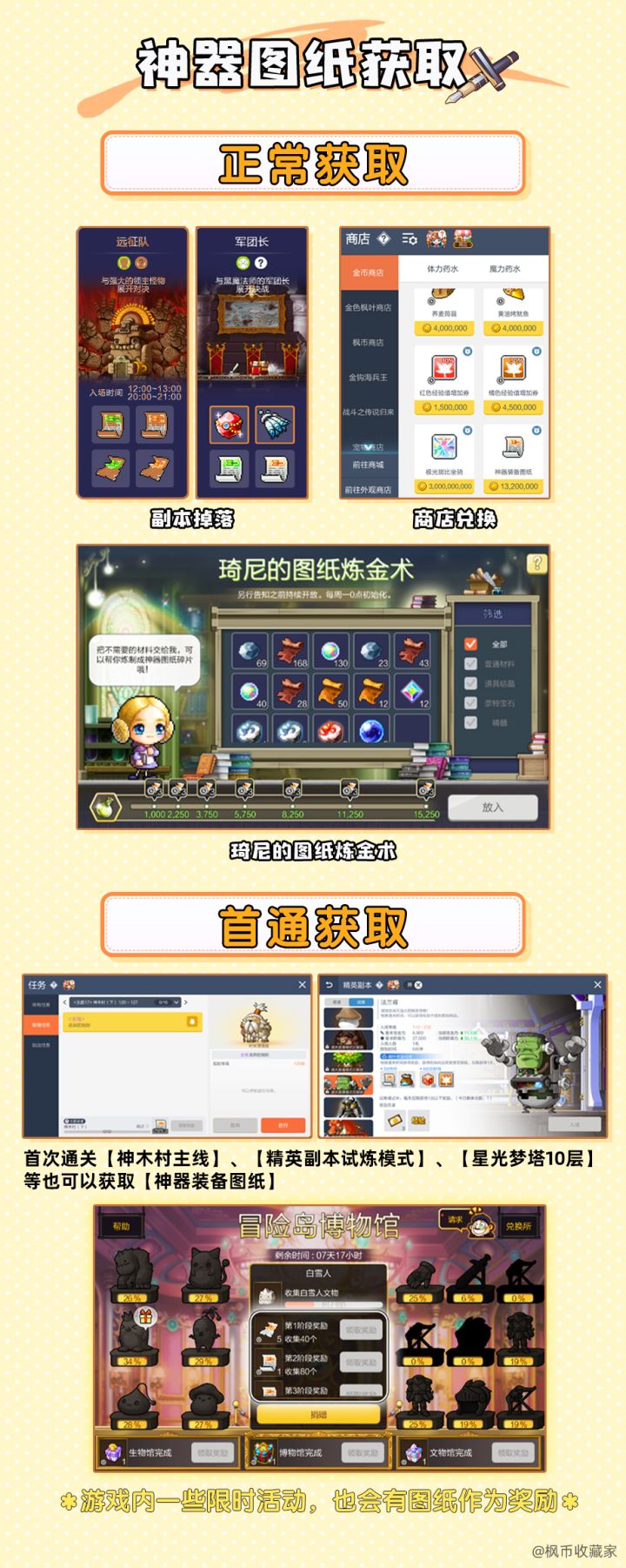 除此之外,首次通关【神木村主线】、【精英副本试炼模式】、【星光梦塔10层】等也可以获取【神器装备图纸】,游戏内一些限时活动,比如【冒险岛博物馆的文物馆】,也会有图纸作为奖励。