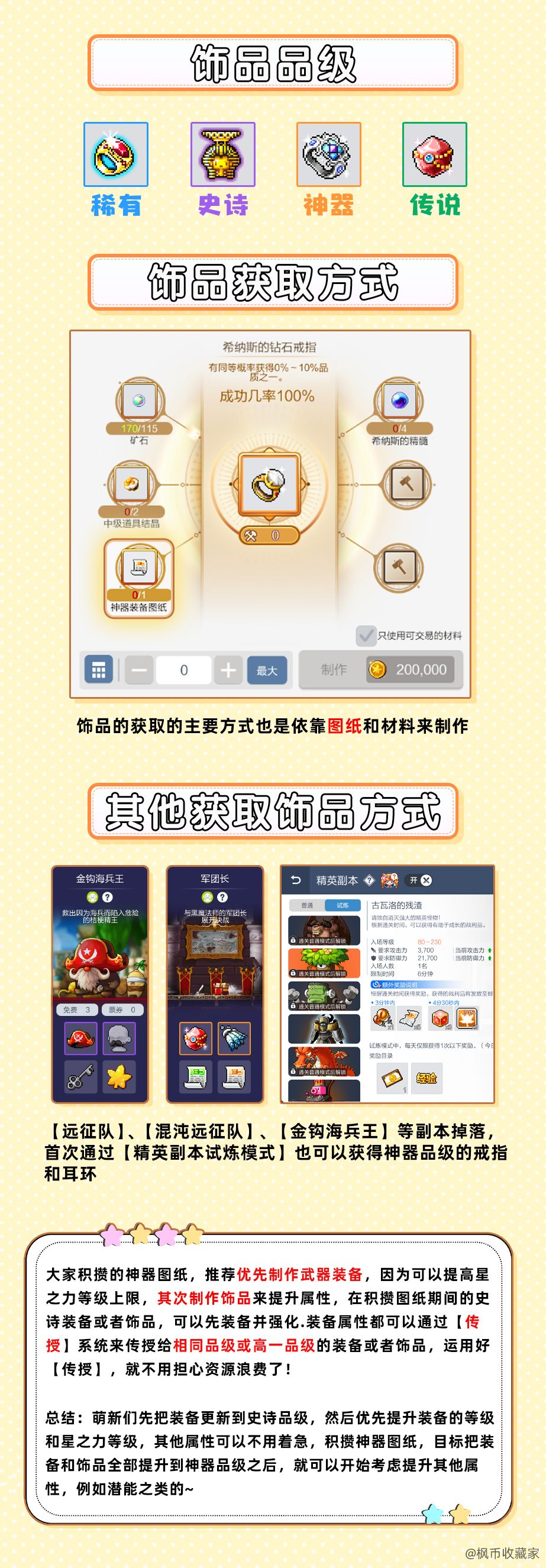 2.【饰品】类按照品级可分为【稀有-史诗-神器-传说】,对应【蓝-紫-橙-绿】颜色。饰品的获取的主要方式也是依靠图纸和材料来制作,当然游戏内还存在些掉落方式,比如【远征队】、【混沌远征队】、【金钩海兵王】等副本掉落,首次通过【精英副本试炼模式】也可以获得神器品级的戒指和耳环
