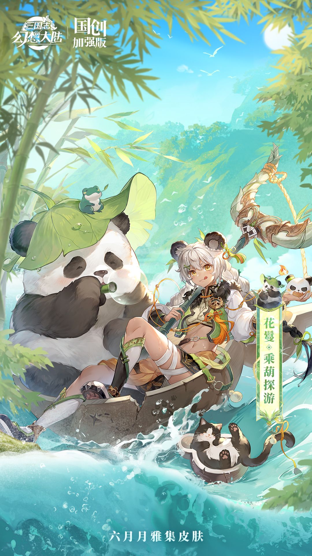 本次以漂流探险为主题的设计,让花鬘的形象洋溢着无限活力与趣味。她身着夏日冒险套装,熊猫头饰及黑白相间的鞋子与她的熊猫伙伴遥相呼应。最引人注目的,莫过于她乘坐的葫芦船。这特制的小船由一个大葫芦切半改造而成,花鬘与她的小伙伴们在这艘葫芦船上,带着无畏的笑容,一同驾驭着河流的奔涌,向着未知的旅程进发。