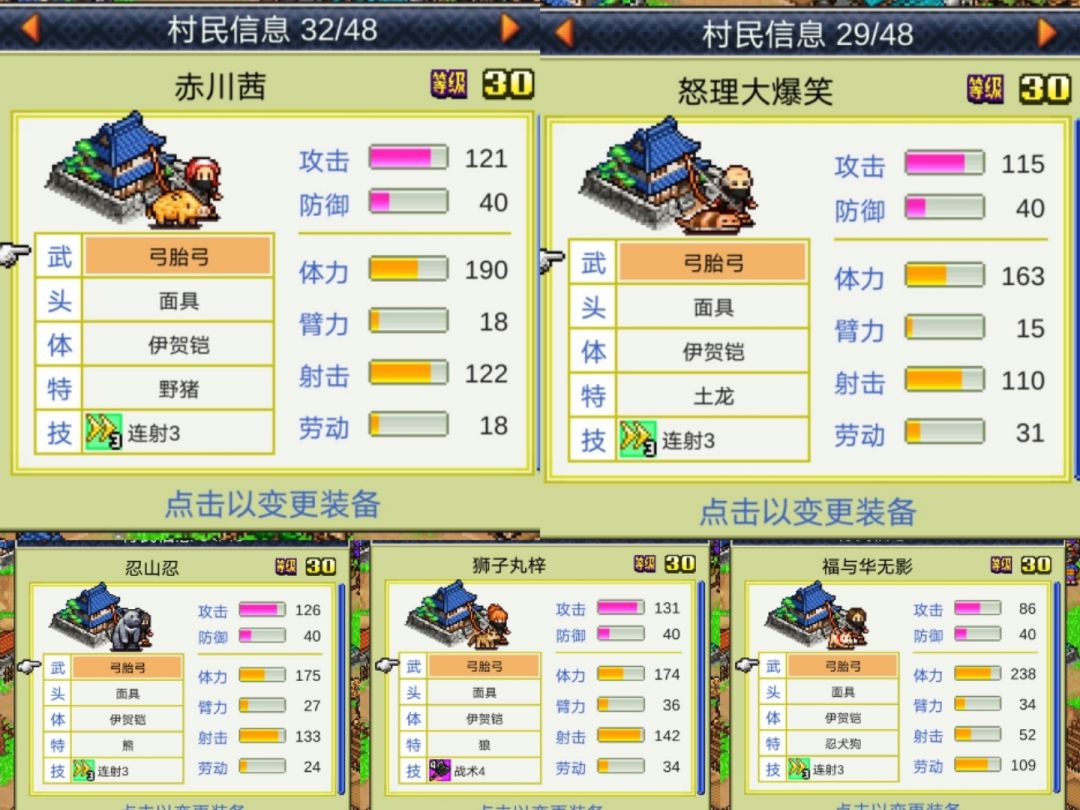 这里呢就统一一点:除去宫本和中野外,步兵骑兵都带南蛮具足加超忍刀,弓兵都带伊贺铠加弓胎弓。(鄙人不才,用了14年才算通关,月入不到一万,前期属实不会玩,就有那么点崩,不过我还是过关了)