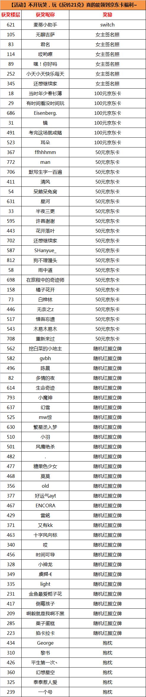 1、中奖楼层仅供参考,以实际昵称为主;
